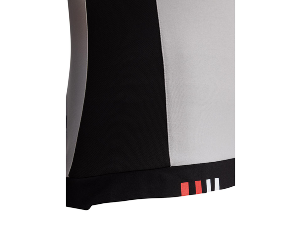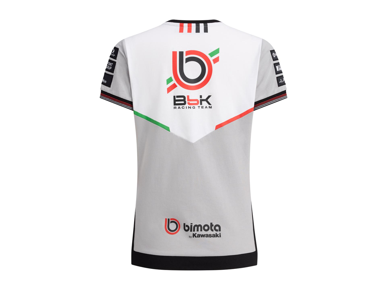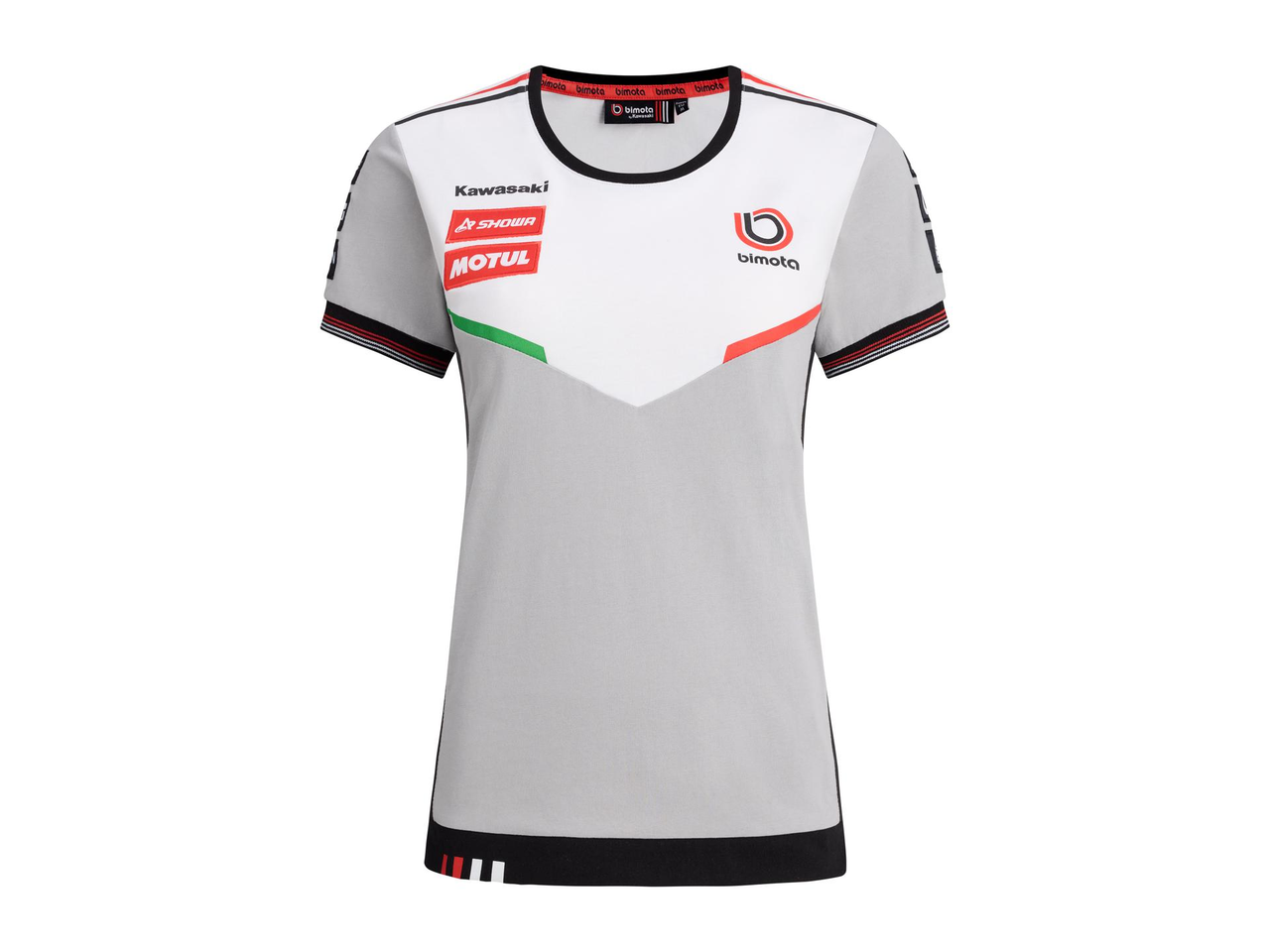 Koszulka z krótkim rękawem i okrągłym dekoltem, którego krawędź jest wykończona czerwono-białym ściągaczem. Na dole znajdują się czerwono-białe oznaczenia Bimota.
