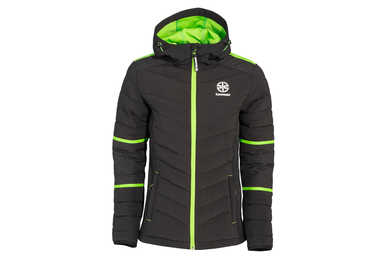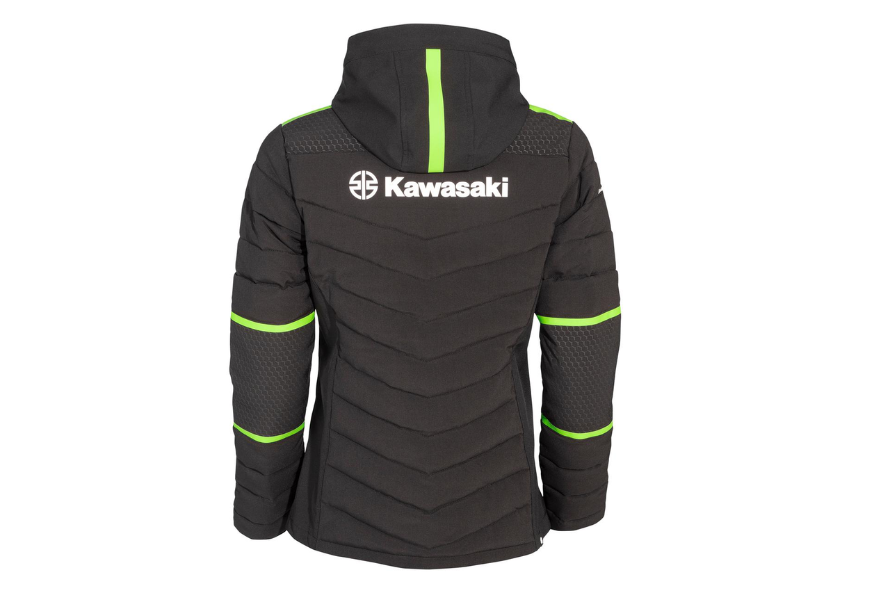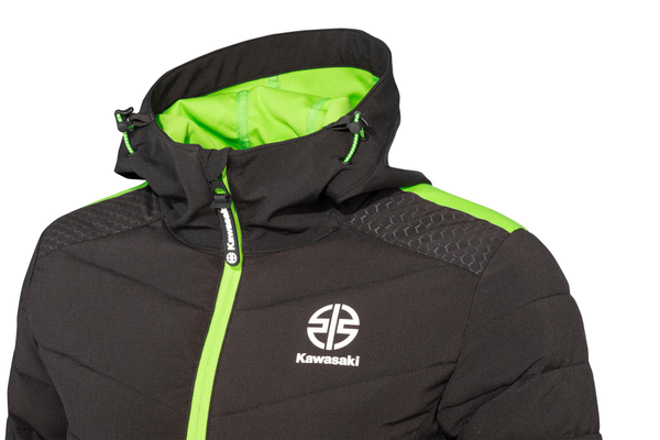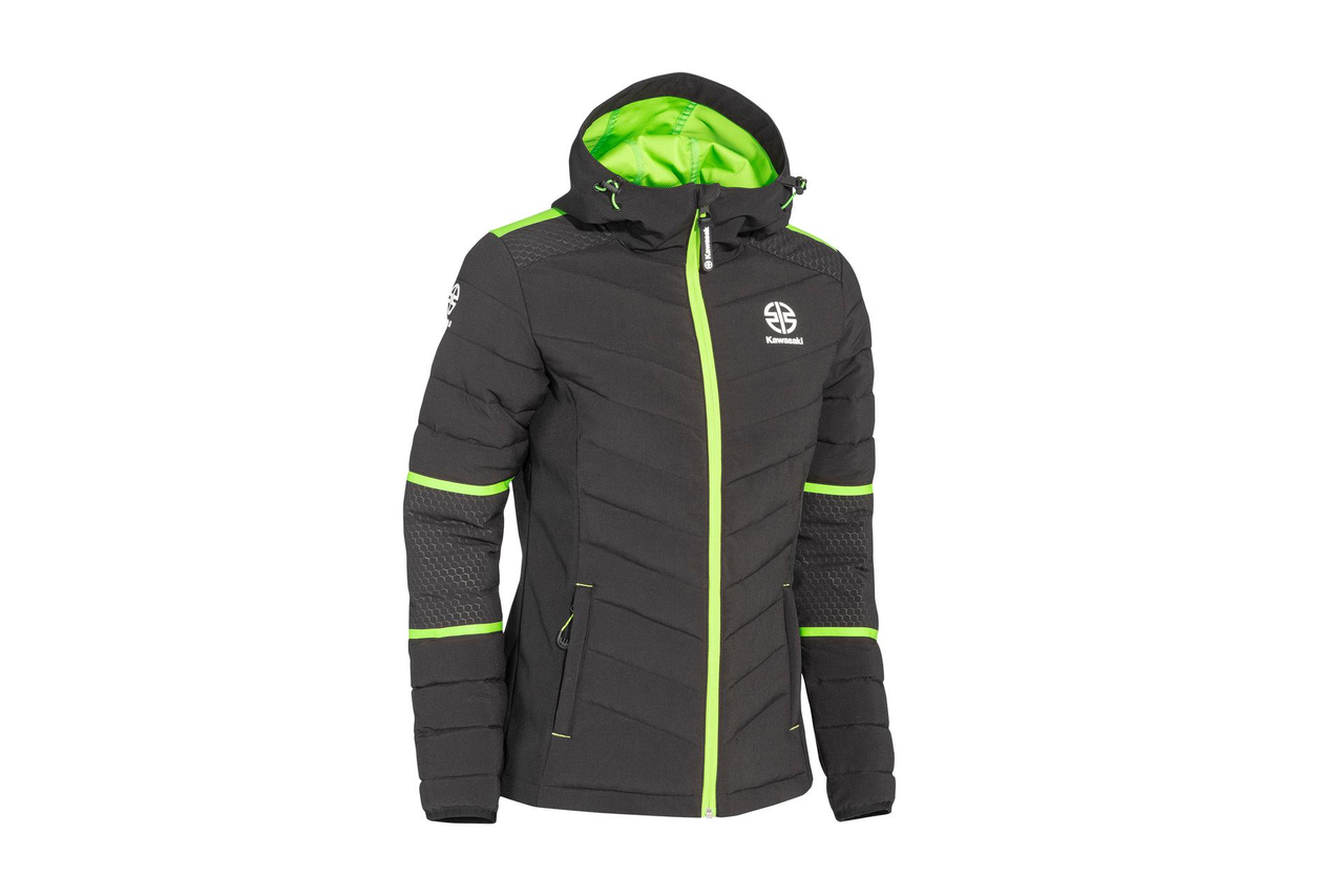 Puchowa kurtka damska z wewnętrznymi i zewnętrznymi kieszeniami zapinanymi na zamek. Pikowane szwy są zaprojektowane zgodnie z projektem Kawasaki. Praktyczny kaptur posiada zieloną podszewkę. Obszary na ramionach i pod pachami wykończono szarym nadrukiem heksagonicznym. Zewnętrzne i wewnętrzne kieszenie na klatce piersiowej są zapinane na zamek błyskawiczny. Nadrukowano zielone detale, które podkreślają przynależność do kolekcji Kawasaki. Materiał wykonania to 96% Poliester / 4% Spandex, Membrana TPU, WP 8000mm BRP 3000mm (normalna wodoodporność).