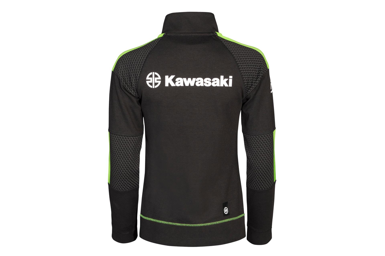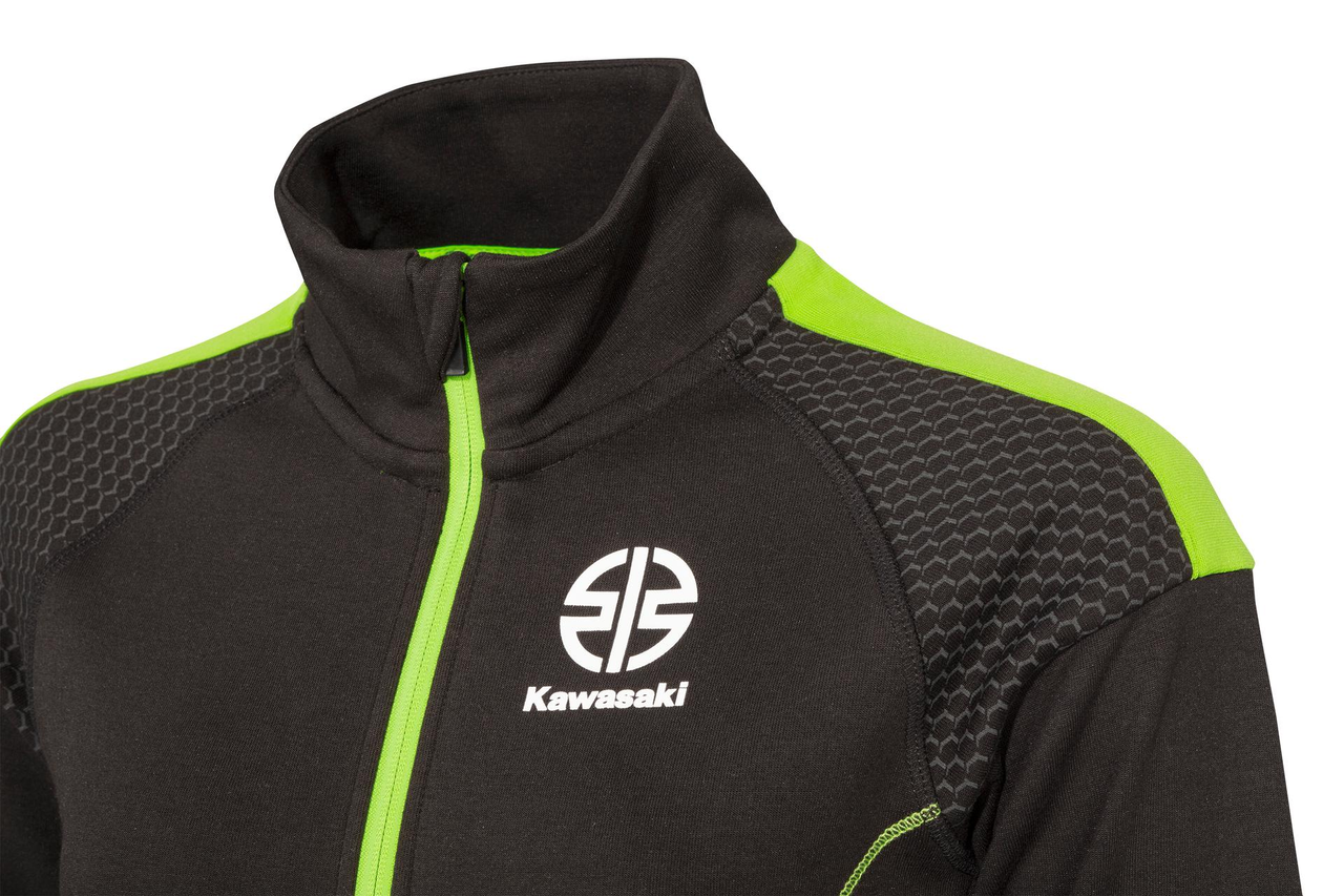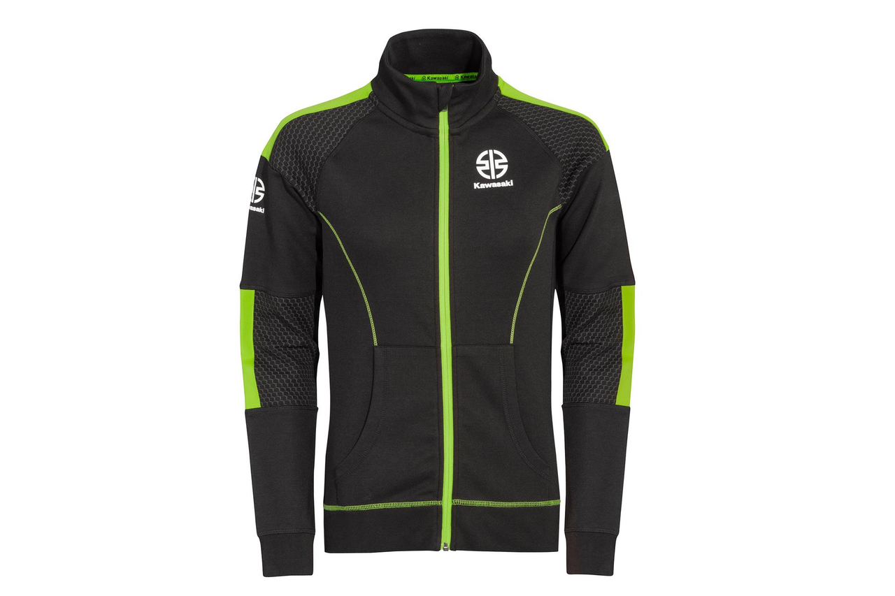 Damska bluza zapinana na zamek błyskawiczny z kieszeniami, stójką, z prążkowanym obszyciem i mankietami. Bluza ze sportowej kolekcji odzieży marki Kawasaki. Model posiada kieszeń typu kangurka. Na ramionach i łokciach nadrukowany został szary heksagon. Bluza wykonana z dwuwarstwowej dzianiny typu interlock (72% bawełna / 28% poliester).