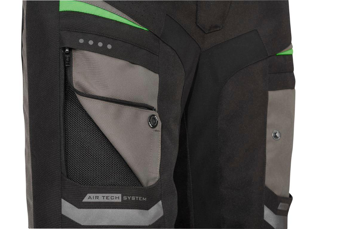 Dodatkowe funkcje pomocnicze obejmują zamki max, zamek błyskawiczny 360 ° do podłączenia do kurtki tekstylnej TRIER oraz obszary wentylacji wlotowej i wylotowej z wieloma kieszeniami, które można otworzyć w razie potrzeby, aby skierować przepływ powietrza do, wokół i z spodni.