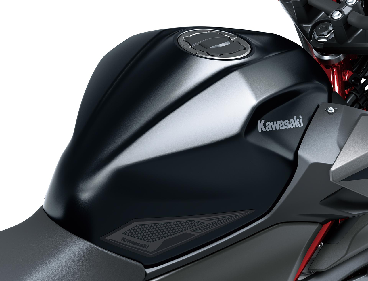 Ten zestaw nakolanników pomaga chronić lakier zbiornika przed zarysowaniami i zwykłym zużyciem. Zestaw ozdobnych nakolanników z czarnej folii z logo Kawasaki i wzorem plastra miodu.