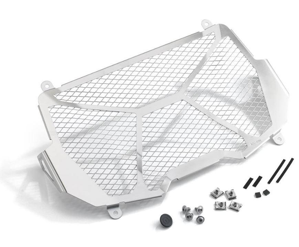 Osłona chłodnicy ze stali nierdzewnej do ochrony i podkreślenia charakteru motocykla. Siatka w kolorze chromu. Produkt marki Kawasaki.
