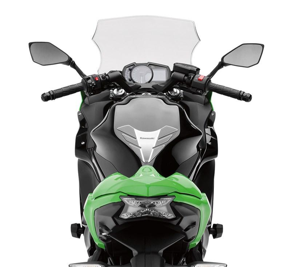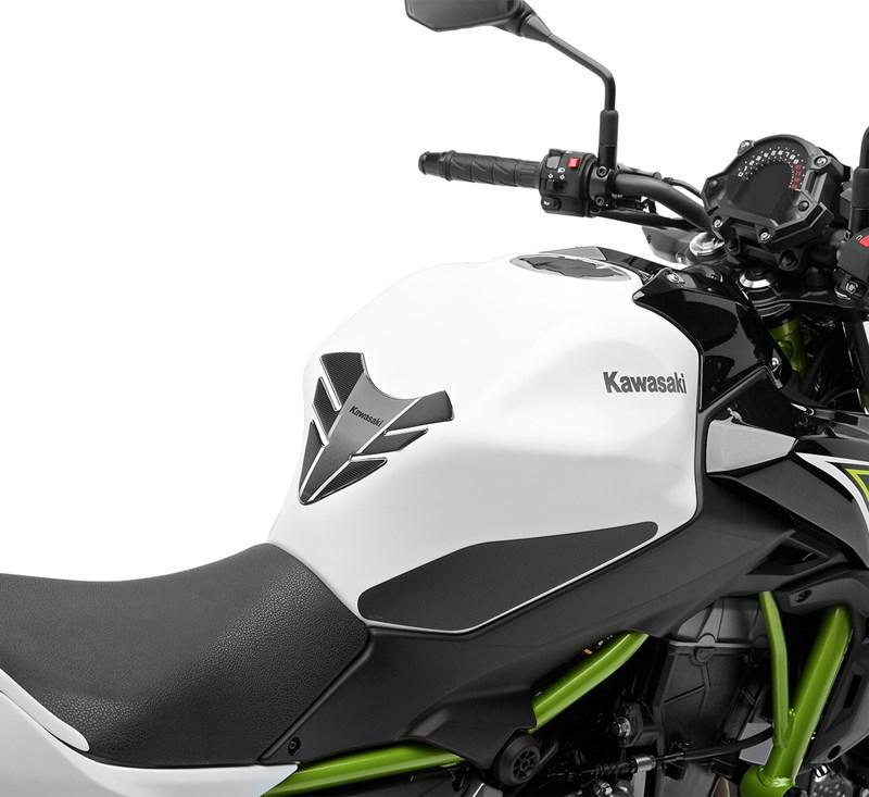 Żelowy tank pad w kolorze czarnym i chrom z logo Kawasaki.